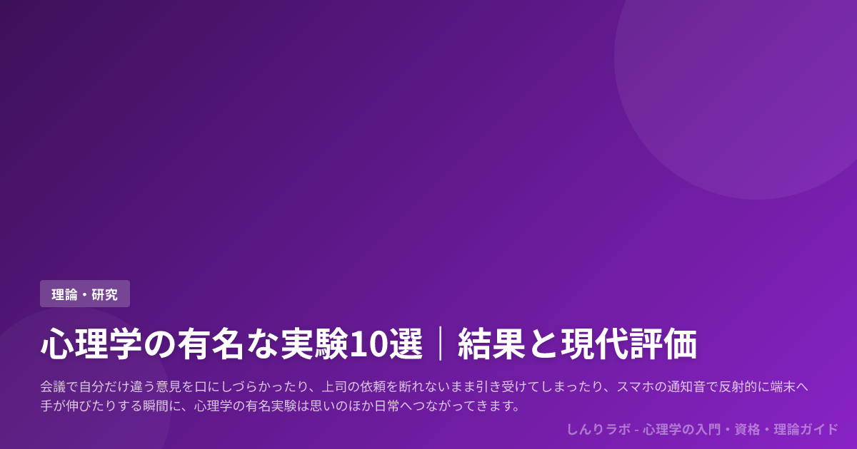 • /theory/服従-ミルグラム(ミルグラム実験の詳解と再評価) (注) 現在サイトに既存記事がないため、上記はあくまで編集候補です。公開後に該当記事を作成して内部リンクを張ることを推奨します。 有名であるほど、批判研究や再現研究、最新レビューまで追って理解を更新する姿勢が欠かせません。「人間はこうだ」ではなく「こういう状況でこうなりやすい」と捉え直すことが、心理学を面白く、しかも雑にしない読み方です。
